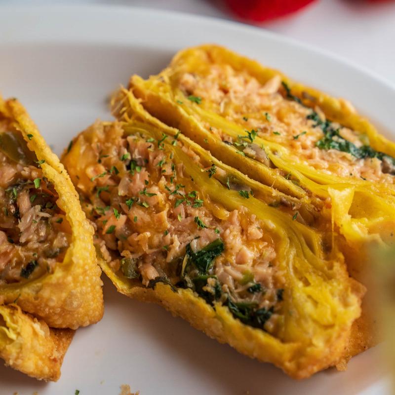 (4) A hand rolled eggroll stuffed with smoked salmon, sauteed spinach, mushrooms, onions, bell peppers and cheese. Served with sweet chili sauce